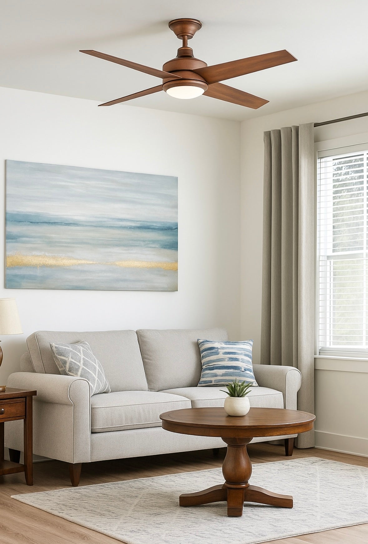 - 4 distressed koa blades with 14 blade pitch for enhanced air movement